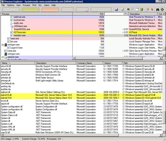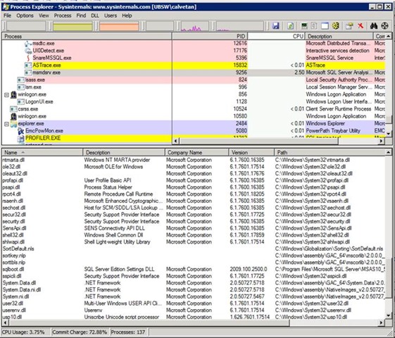 - Enter process explorer. Below is a snapshot of the dll’s loaded into the SSAS address space immediately after a restart (sorted alphabetically by dll).