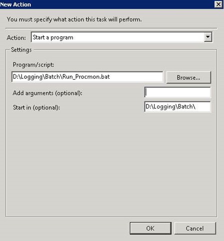 - Next move to the actions tab and create a new action to start a program and populate it similarly to as shown below. You are pointing it at the Run_Procmon.bat that you downloaded earlier.