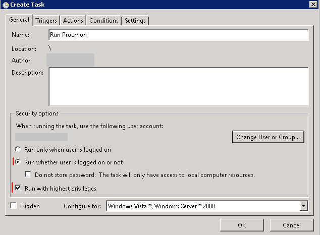 - Pull up the task scheduler and create a new task. The first screen should be setup as below noting the 2 points in red. The account you use to run the task needs to have local admin.