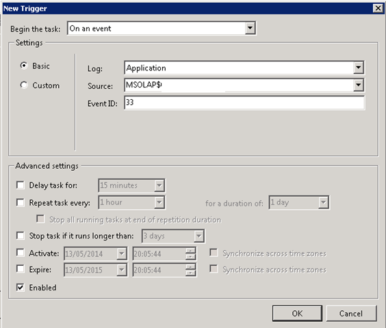 - Move to the triggers tab and this time rather than creating a schedule choose “On an event” and then select the appropriate windows event that you want to use as a trigger. Below is an example showing a trigger configured to fire when SSAS logs event ID 33 to the application log. If required you can define multiple events.